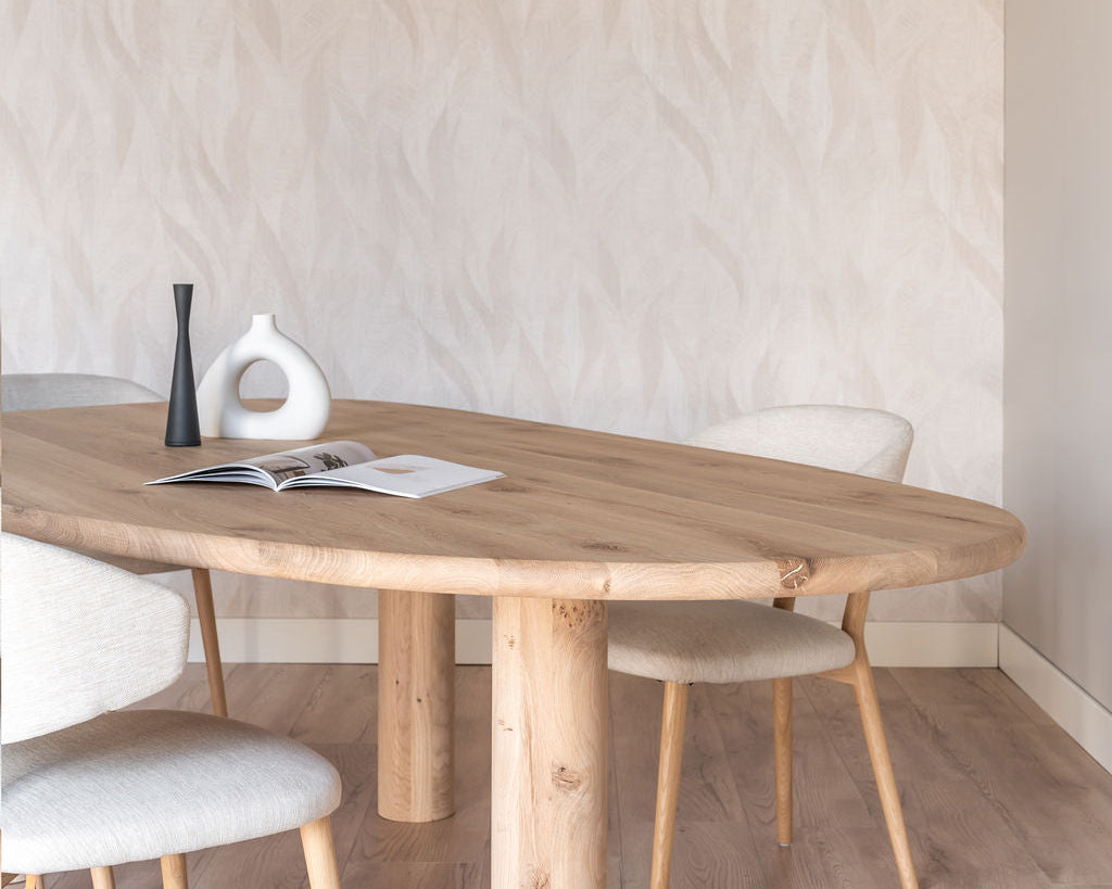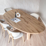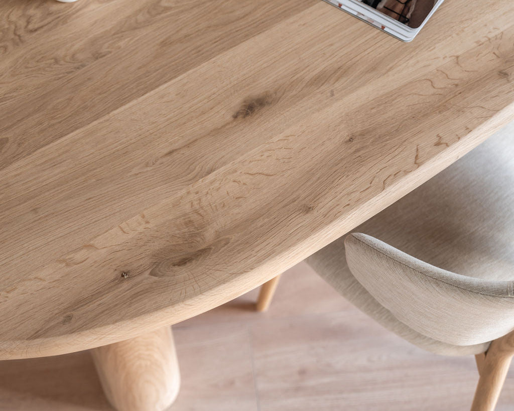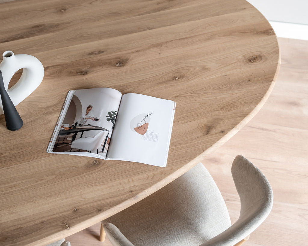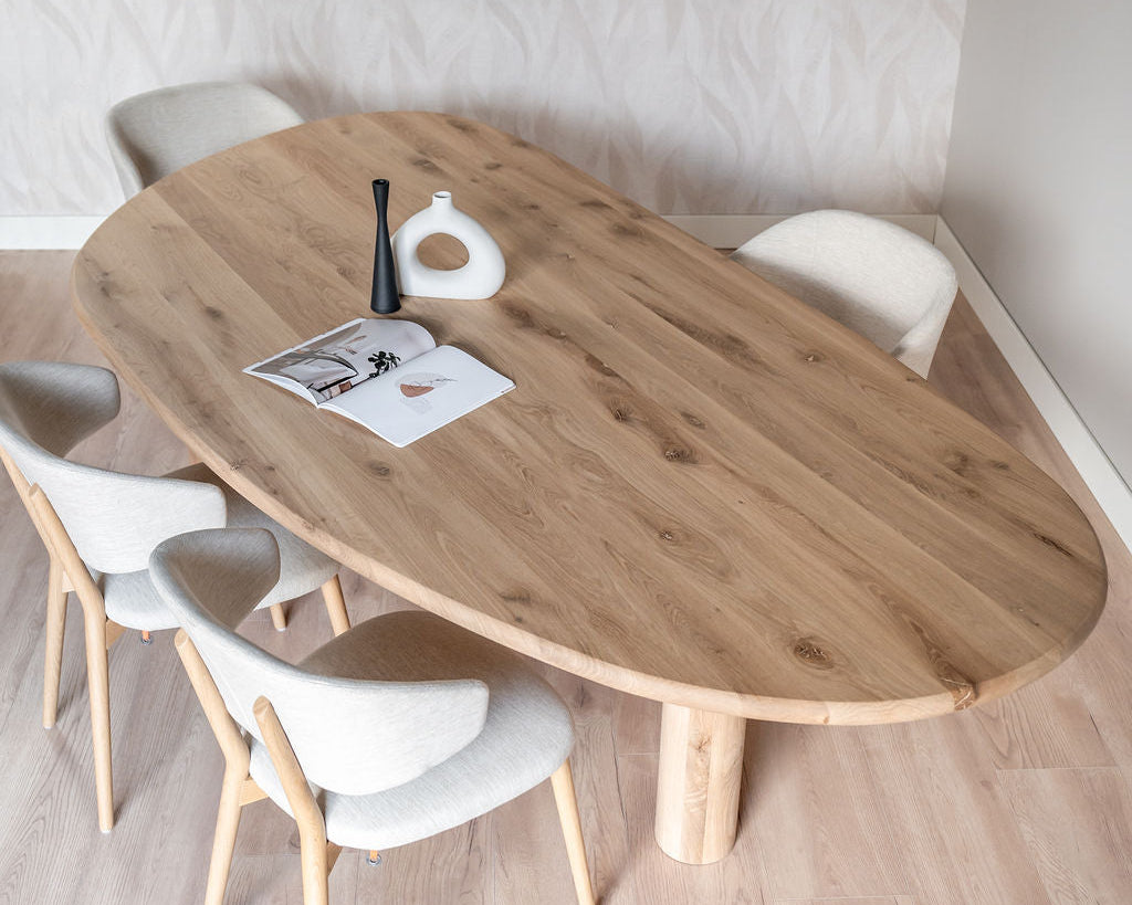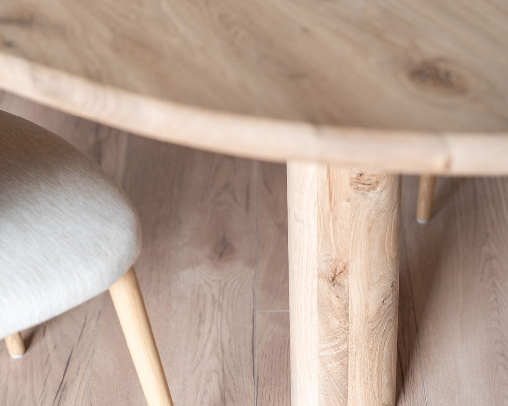 Maak kennis met onze prachtige organische eiken eettafel rondo. volledig gemaakt uit massief eikenhout in onze eigen werkplaats. Met zijn eigentijdse ontwerp, samen met drie stijlvolle ronde poten van 15 cm doorsnee, is deze tafel niet alleen functioneel maar zal ook een prachtig geheel vormen in jou eetkamer.
